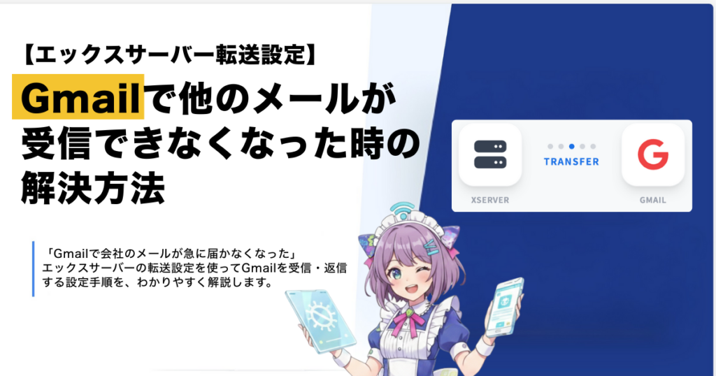 GmailのPOP受信が使えなくなり、会社のメールが届かなくなった方へ。エックスサーバーの転送設定を使えば、今まで通りGmailで受信できます。サーバーパネルの操作手順を画像付きでわかりやすく解説します。 ホームページ運用・トラブル解決