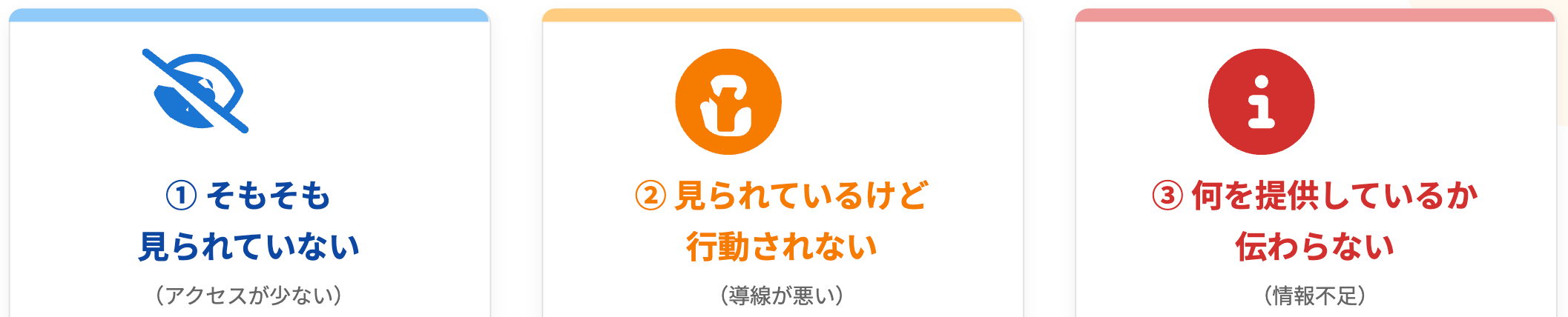 ホームページで集客しようとした時に、うまく行かない理由として3つ挙げられます。