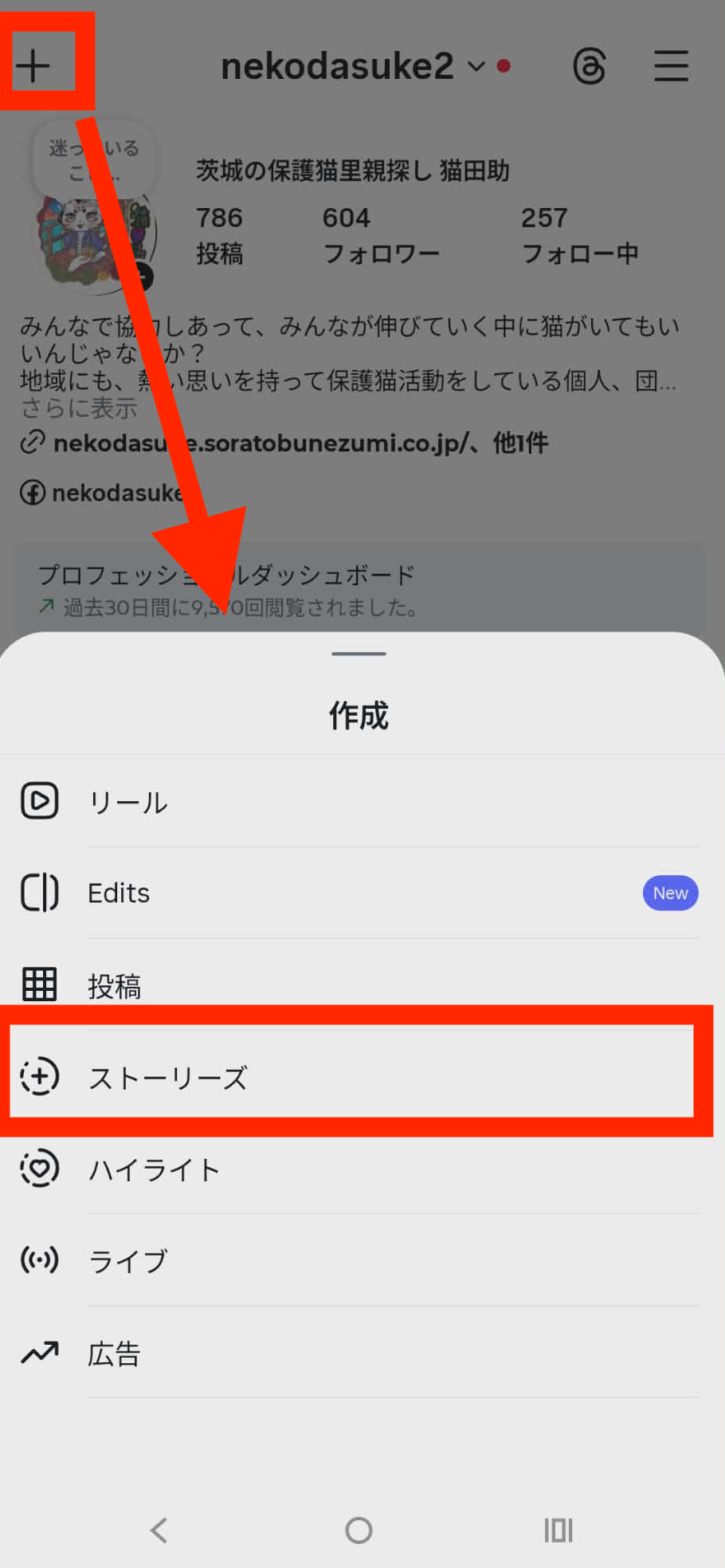 ホーム画面左上の「+」またはプロフィール写真をタップします。