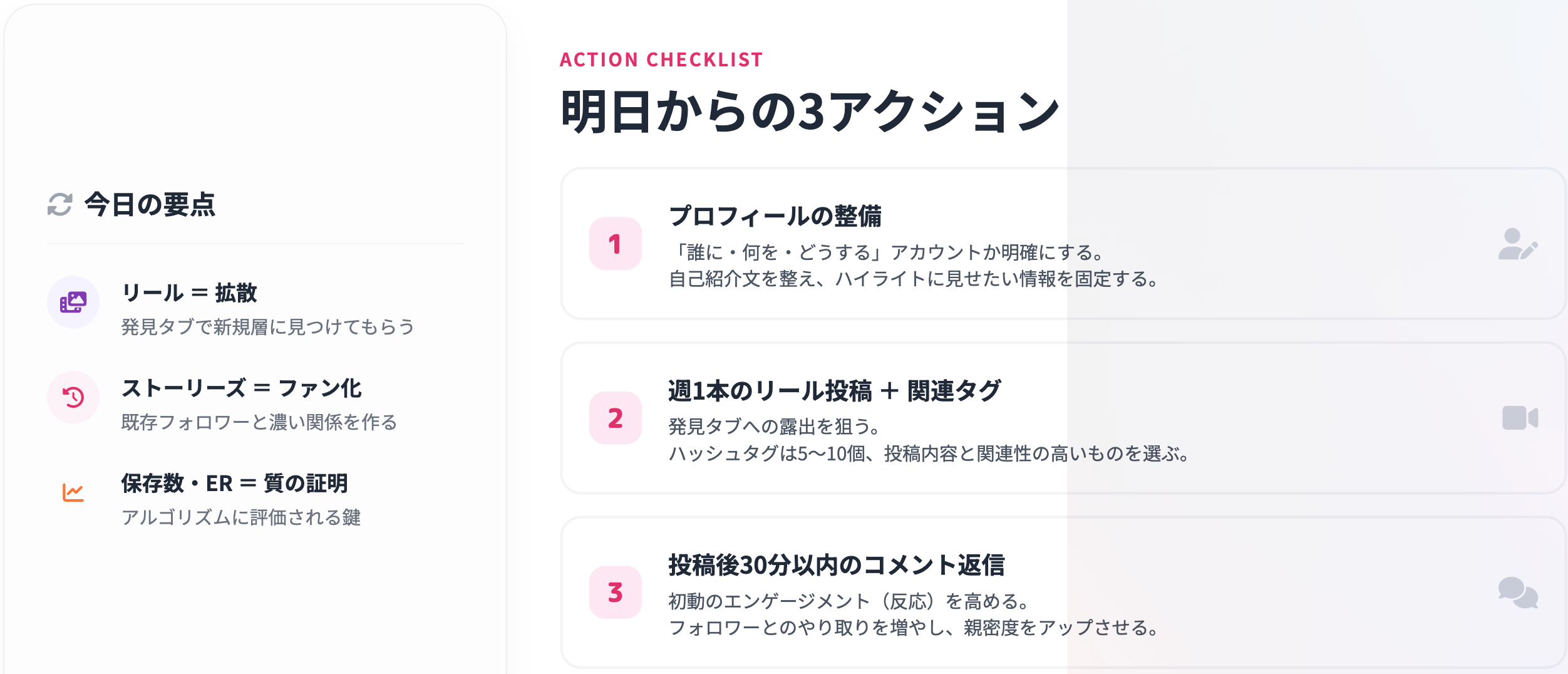 項目 リール ストーリーズ 表示期間 ずっと残る 24時間で消える 長さ 15秒〜90秒 写真15秒・動画60秒 用途 拡散向け リアルタイム情報 表示場所 フィード・発見タブ ストーリーズ枠 - ハッシュタグは何個まで付けられる?