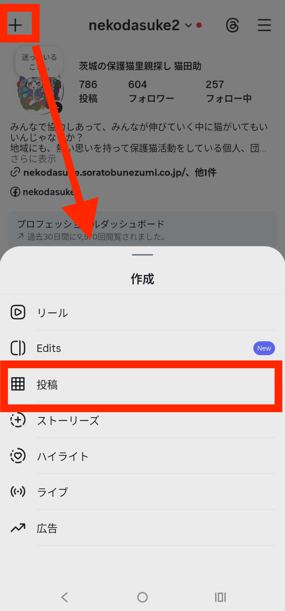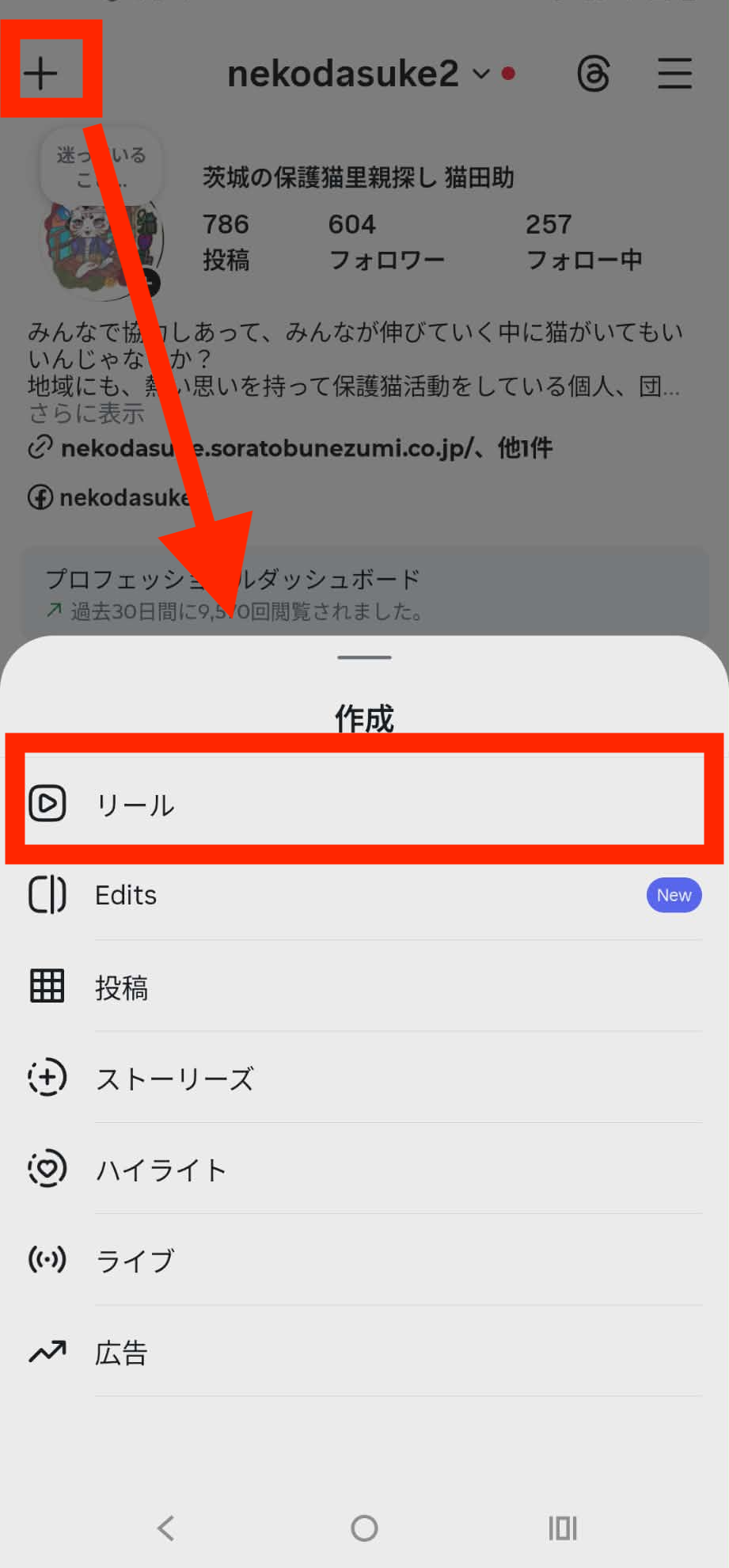 ホーム画面下部の「+」→「リール」から投稿できます。