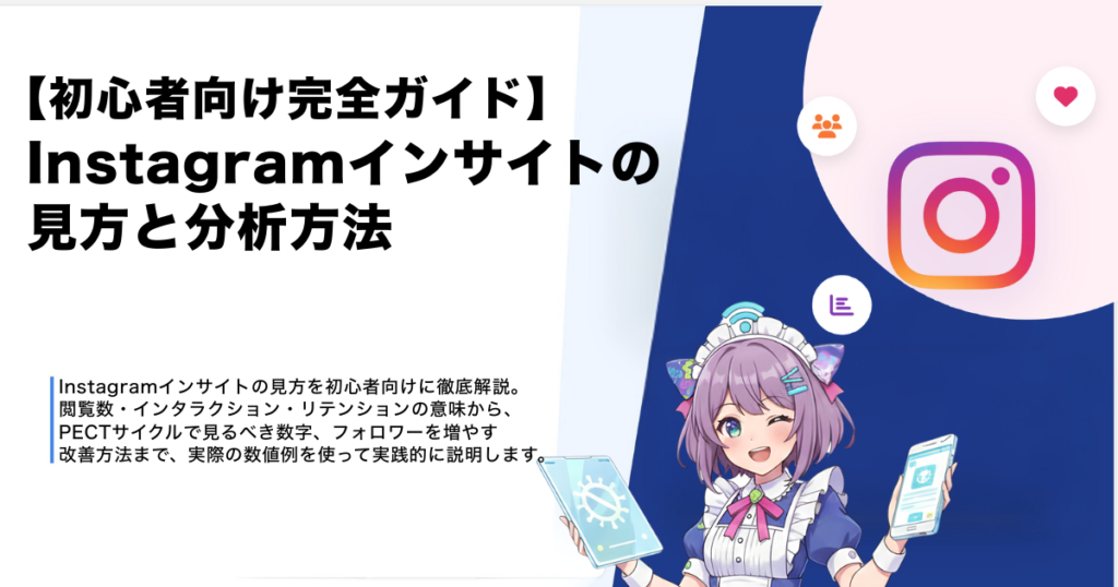Instagramインサイトの見方を初心者向けに徹底解説。閲覧数・インタラクション・リテンションの意味から、PECTサイクルで見るべき数字、フォロワーを増やす改善方法まで、実際の数値例を使って実践的に説明します。