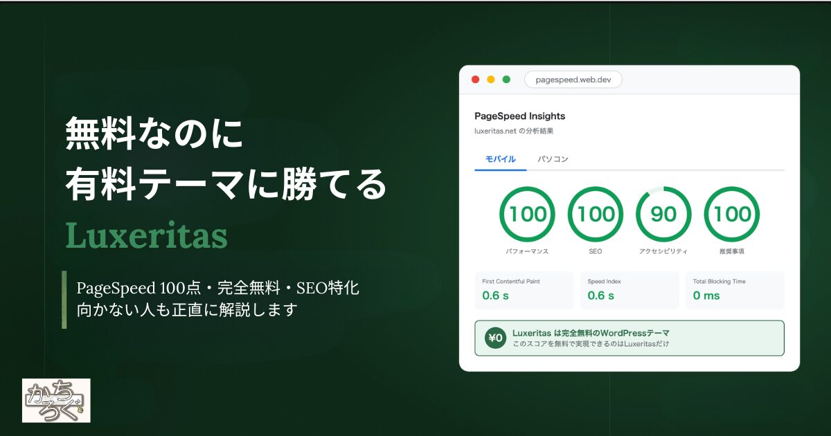 無料WordPressテーマ「Luxeritas(ルクセリタス)」のレビュー。有料テーマに匹敵する表示速度とSEO機能を持ちながら完全無料。実際に使って分かったメリット・デメリットと、向かない人を正直に解説します。 -